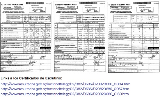 Hemos detectado en al menos dos Actas Oficiales (Mesas 57 y 160) CERO VOTOS para CAMBIEMOS en todas las categorías y un Acta (Mesa 4) con ONCE VOTOS en la Categoría Intendente. En los certificados de escrutinio de nuestros FISCALES los votos para CAMBIEMOS NECOCHEA son de 230 votos en esas mesas.