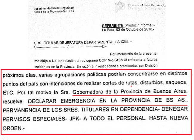 Con logo oficial, fechada el 2 de octubre y “firmada” por Perroni, la circular que se multiplicó por las redes sociales y que la Provincia asegura que es falsa, señala que “en razón a investigaciones practicadas por División de Prevención del Delito de esta Policía quienes logran determinar que en los próximos días, varias agrupaciones políticas podrían concentrarse en distintos puntos del país con intenciones de realizar cortes de rutas, disturbios, saqueos, etc. Por tal motivo, la señora gobernadora de la provincia de Buenos Aires resuelve declarar emergencia en la provincia de Bs. As”.