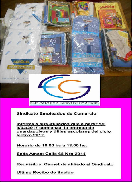 El Sindicato de Empleados de Comercio informa a sus afiliados que a partir del día Jueves 9 de Febrero comienza la entrega de guardapolvos y útiles escolares correspondiente al ciclo lectivo 2017.