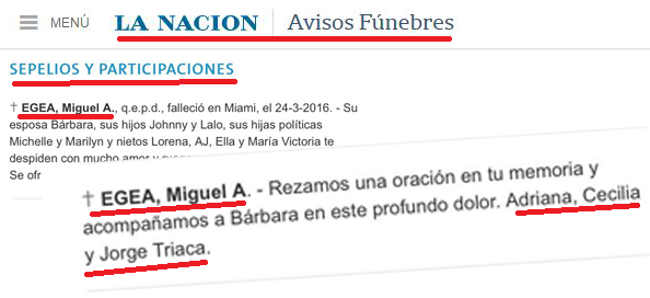 Egea murió en Miami, en el simbólico 24 de marzo de 2016 cuando se cumplían 40 años del golpe de Estado. Triaca hijo firmó el saludo junto a su esposa y su madre. “EGEA, Miguel A., q.e.p.d. – A un mes de su partida, se celebrará una misa en su memoria el jueves 28, a las 17.45, en la iglesia del Socorro, Juncal 880”, publicó la sección de avisos fúnebres del diario La Nación. Un mes antes, el mismo diario publicó sólo cinco avisos con la noticia de su muerte. Como los diarios no salieron el 25 de marzo, los avisos se publicaron el día 26. El primer aviso llevó la firma de su esposa Bárbara Franz, una norteamericana, que aparece como apoderada de varias empresas vinculadas a la ESMA. Y el segundo aviso está firmado por el actual ministro de Trabajo y su entorno familiar. “EGEA, Miguel A. – Rezamos una oración en tu memoria y acompañamos a Bárbara en este profundo dolor. Adriana, Cecilia y Jorge Triaca”. Cecilia se llama la esposa del ministro y Adriana se llama su madre.