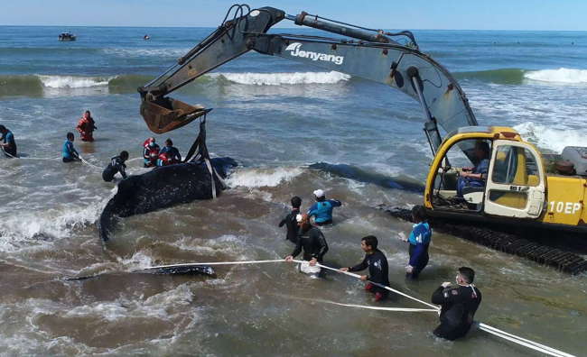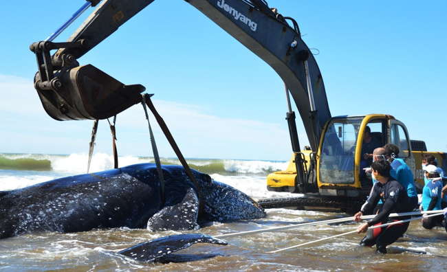 Finalmente, y aunque el panorama no era alentador, se apeló a una última estrategia: el equipo coordinado por los expertos de la Fundación Mundo Marino logró ubicar las cinchas debajo del pesado animal para que la retroexcavadora pudiese moverlo a un lugar del mar con mayor profundidad.