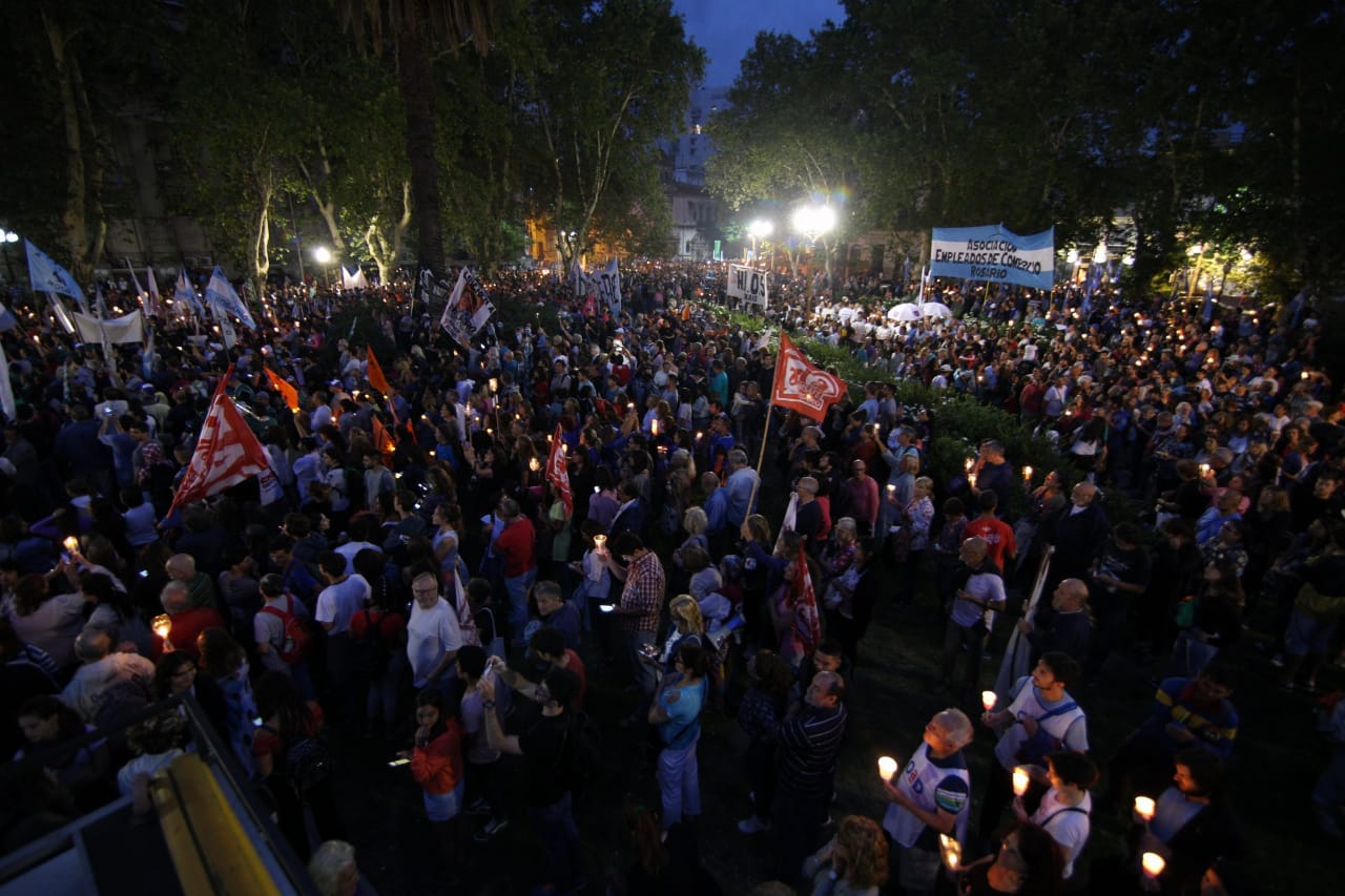 Cerca de las 20, cuando la columna principal se acercó a la sede de Gobernación, empezaron a encenderse las antorchas y el escenario principal se colmó de referentes sindicales, para dar comienzo al acto. Los organizadores estimaron que más de 100 mil personas participaron de la movilización, que llegó a ocupar más de ocho cuadras.