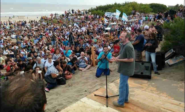El desplazado director de la AFSCA, Martín Sabbatella, encabezó este sábado un acto en una playa de la localidad balnearia de Villa Gesell en protesta contra el decreto que modificó la Ley de Servicios de Comunicación Audiovisual.