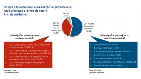 Del otro lado, los que privilegian en su voto la mejora de la economía, apuntan en primer lugar a la inflación, luego al trabajo, que mejore la actividad y que rinda más el salario. Todos ellos están en sintonía con el 70 por ciento que dice que la economía está mal o muy mal.