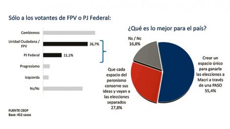 La alternativa le fue presentada únicamente a quienes dijeron que votarían a candidatos opositores. La mayoría (55,4 por ciento) se inclinó por la primera variante: todos juntos y dirimiendo en unas PASO. La minoría (27,8 por ciento) se inclinó por la variante de cada uno por su lado.