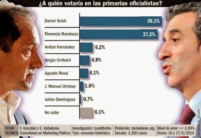 La intención de voto entre los kirchneristas coloca a Scioli en primer lugar con el 39,1%; a Randazzo, en el segundo con el 37,2%; siguen el senador Aníbal Fernández con 6,2%, el gobernador entrerriano, Sergio Urribarri, con 4,8%, el ministro de Defensa, Agustín Rossi, con 4,1%, el gobernador salteño, Juan Manuel Urtubey, con 1,8% y el diputado Julián Domínguez con 0,7%.