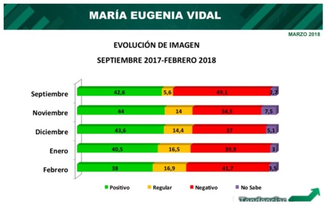 Por su parte María Eugenia Vidal también vio una merma, aunque menor, de su imagen positiva. En noviembre alcanzó su punto máximo de postividad con un 44%, disminuyendo al 38% en febrero de este año. En cuanto a la imagen negativa y regular, la gobernadora bonaerense suma 58.6% en febrero de 2018.