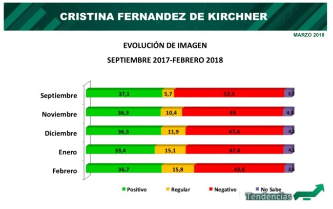 En tanto, la ex presidenta Cristina Fernández de Kirchner mantienen una imagen positiva con menor fluctuación que la de Macri y Vidal. Según los bonaerenses, en septiembre presentaba una imagen positiva del 37.1% y en febrero de este año 36.7%. En cambio la imagen negativa era 53% en septiembre y ahroa bajo a 43%.