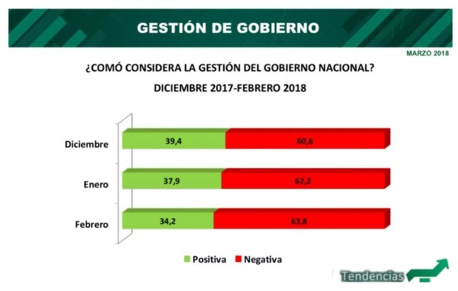 En una nueva encuesta realizada por la consultora Tendencias en la provincia de Buenos Aires sobre la evolucion de los dirigentes politicos y su gestión, el presidente Mauricio Macri continua cayendo y solo tiene una imagen positiva de 28,4%, mientras que en septiembre era del 36,4% y en noviembre del 38.1%, bajando en cuatro meses 10 puntos. Por su parte, la imagen negativa y regular trepo a un 66.9%.