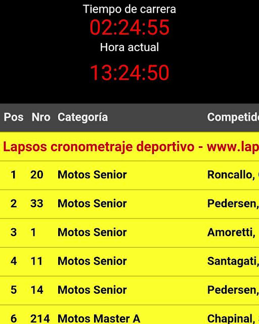 Desde el inicio, el piloto local Pilu Roncallo, de gran performance, se lideró la competencia seguido muy de cerca por Pedersen y Amoretti. Ese orden se mantuvo a lo largo de toda la carrera y Pilu, al final, se quedó con el primer puesto en motos.
