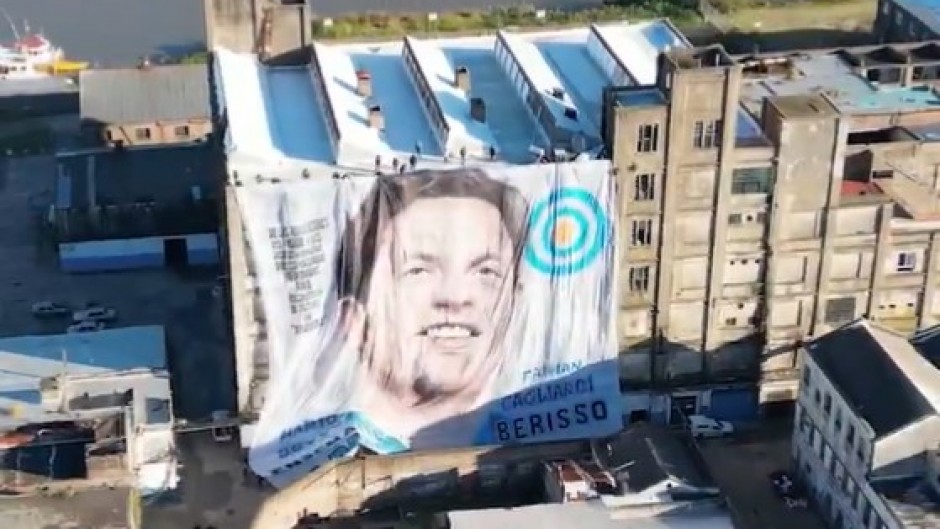 «De las revoluciones del pasado a los desafíos del mañana. Berisso y Ensenada hermanadas para reconstruir el futuro de Argentina», es el mensaje que se inscribe a un costado del rostro gigante de Kicillof.