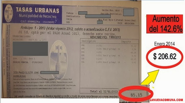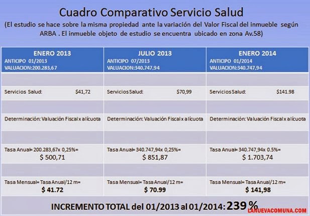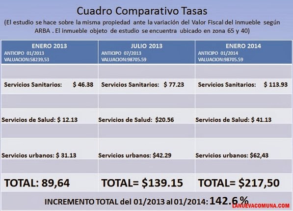 Según lo calculado, la suma del revalúo inmobiliario provincial más el aumento solicitado por la actual gestión municipal da un aumento de 142,6 % para el bolsillo de un contribuyente. En uno de los gráficos se calculó que a partir de una boleta que en enero de 2013 debió abonar 85 pesos, para enero de 2014 con el mencionado aumento la cifra que debería abonar asciende a 206 pesos.