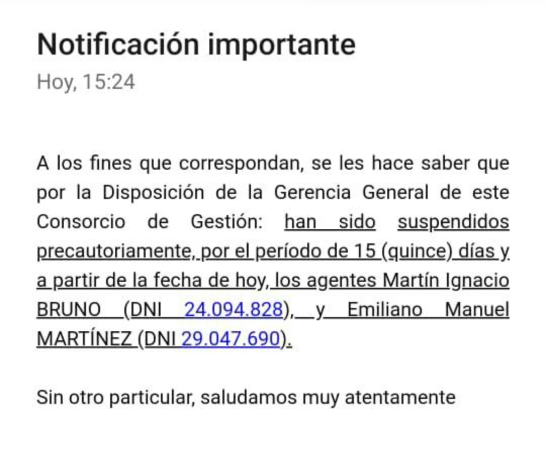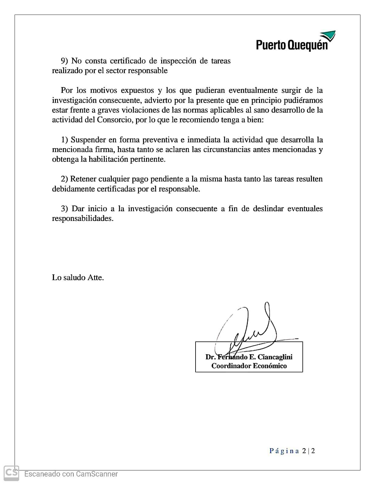 Ante todo este obscuro panorama, Ciancaglini finaliza su documento haciendo hincapié en que se suspenda a los agentes hasta tanto se aclare la situación, además de que se ponga en marcha la investigación pertinente al caso y se detenga cualquier pago pendiente hasta tanto las tareas resulten debidamente certificadas por el responsable.