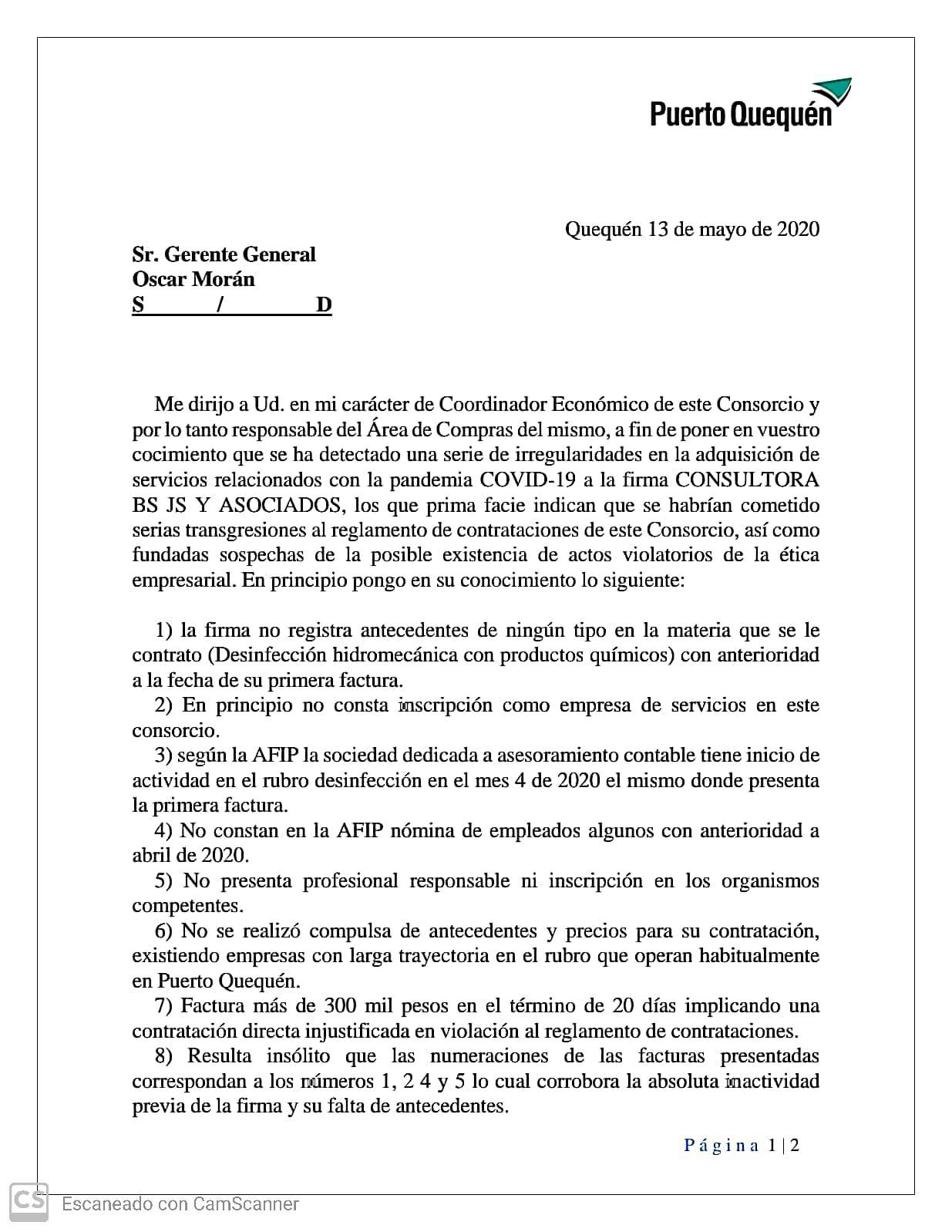 Un verdadero escándalo sacude por estas horas al Consorcio de Gestión de Puerto Quequén, con una grave denuncia que lleva la firma del Coordinador Económico, Dr. Fernando Ciancaglini, realizada el 13 de mayo y dirigida a quien hoy ocupa el sillón de gerente General del ente portuario, Oscar Morán. El contundente documento salpica directamente a los agentes Martín Bruno y Emiliano Martínez, quienes en consecuencia fueron suspendidos de sus cargos por el término de 15 días.