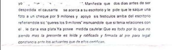 Las denuncias de la víctima son gravísimas. El relato que sigue es uno de los tantos que involucra al sindicalista local: la denunciante «Manifiesta que dos días antes de ser despedida el causante se acerca a su escritorio y le pide que le saque una foto a un cheque por 9 millones y apoya sus testículos arriba del escritorio refiriéndole sic «querés los 9 millones» insinuándole que si tenía relaciones con él, le daría esa plata». Como se advierte en la denuncia, la mujer fue despedida días después.