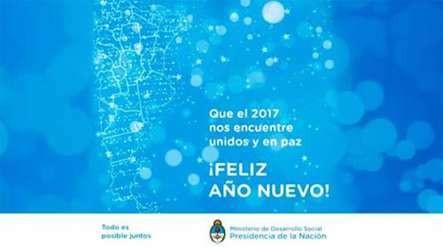 “Que el 2017 nos encuentre unidos y en paz ¡FELIZ AÑO NUEVO!”, dice el tuit publicado en la cuenta del ministerio de Desarrollo Social, que va acompañado de una foto en la que no aparecen las Malvinas ni el sector de la Antártida sobre el que la Argentina reclama soberanía.