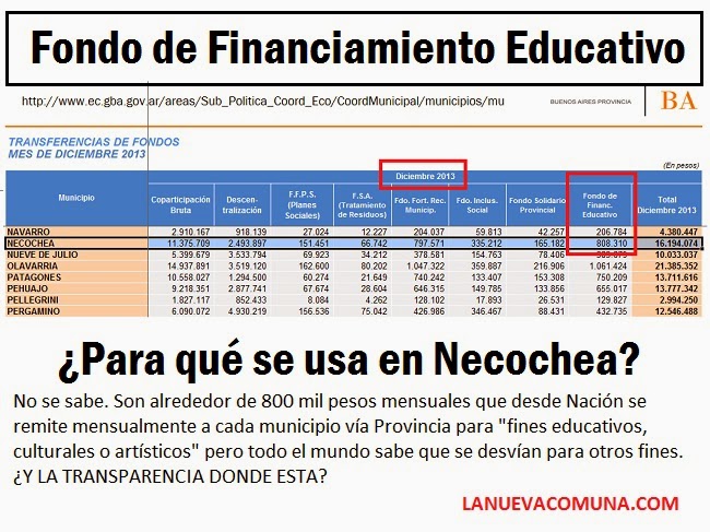 Desde hace tiempo, desde LANUEVACOMUNA.COM venimos informando acerca de un cuantioso recurso financiero que recibe el municipio de Necochea destinado exclusivamente para educación y cultura. Sin embargo, la decisión del ejecutivo es destinar ese dinero para otros fines… ¿entre ellos el político?