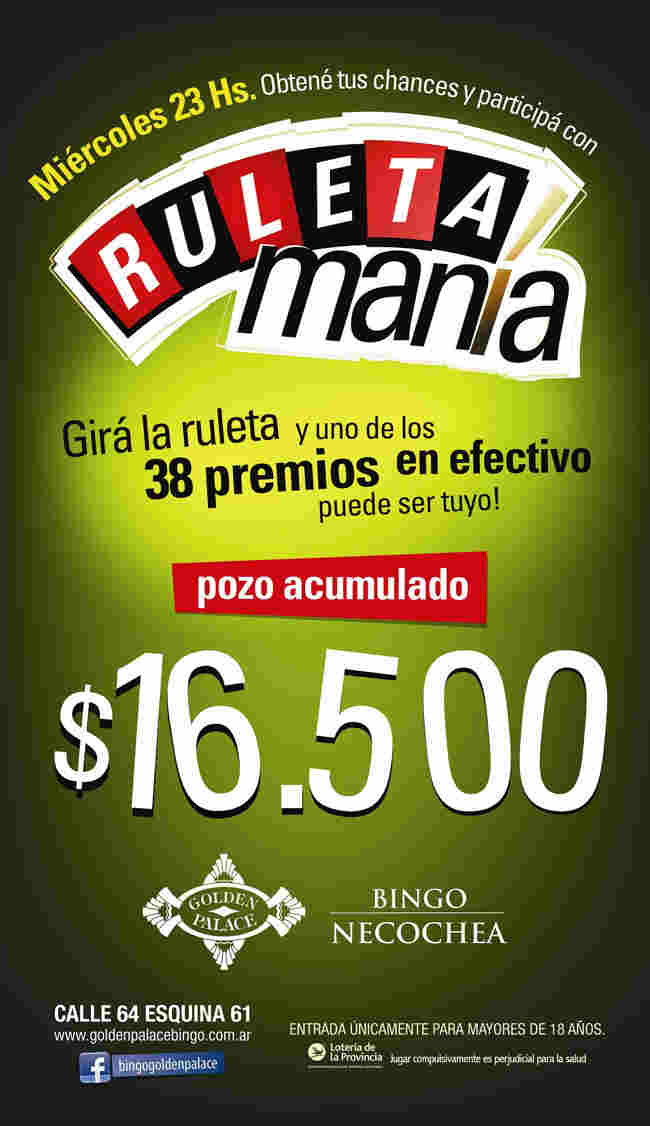 Los días miércoles en Bingo Golden Palace, ubicado en calle 61 esquina 64 de Necochea, el público puede disfrutar de una variedad de promociones especiales y premios acumulados, con entrada general sin cargo para mayores de 18 años.