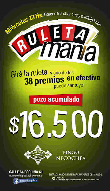La Promo cuenta con 38 premios de hasta $ 1.000 en efectivo y el pozo acumulado a la fecha de $16.500 en efectivo. Si ninguno de los participantes acierta el casillero que contiene dicho pozo, el mismo acumulará $ 1.500 más para el próximo día miércoles. Se puede participar de la misma obteniendo las “chances” en la sala de Bingo Golden Palace.
