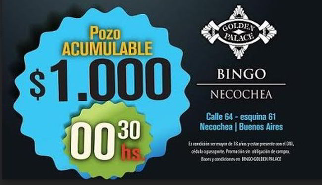 Todos los Martes en Bingo Golden Palace ubicado en calle 61 esquina 64 de Necochea, el público puede disfrutar de una variedad de promociones especiales y premios acumulados, con entrada general sin cargo para mayores de 18 años.