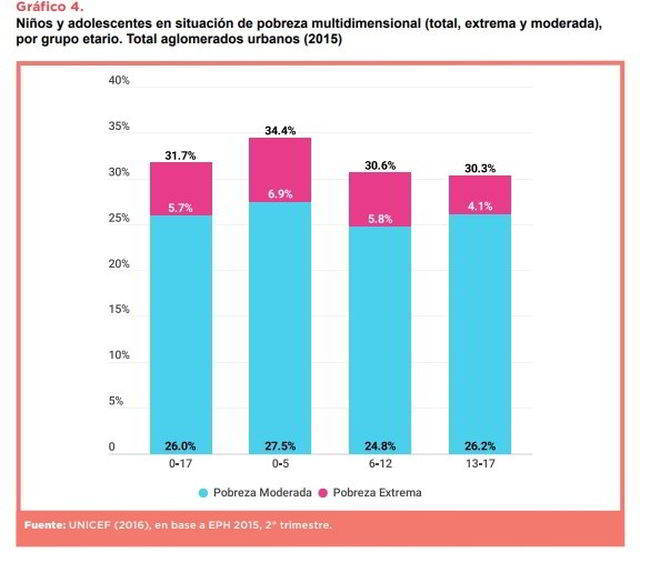 Asimismo aseguraron que en el primer trimestre de 2018, un 39,4% de menores de 18 años en aglomerados urbanos vivían en situación de pobreza. “Este porcentaje casi duplica el 20,5% referido a la población de 18 años o más. Lo mismo se verifica al analizar la situación de indigencia, que alcanza al 8,1% de los niños y adolescentes argentinos y desciende a 3,8% para la población mayor de 18 años”, añadieron.