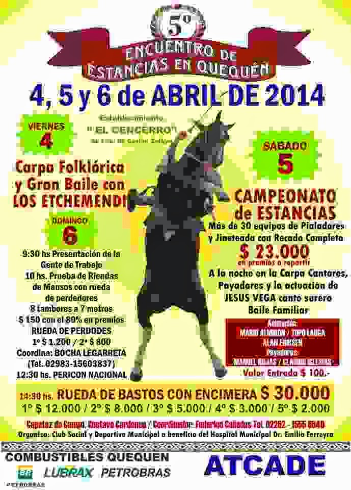 Las destrezas comenzarán el sábado 5 desde la 9 con los equipos de pialadores y jineteadas con recado completo, entregándose importantes premios. Por la noche, en la carpa habrá cantores, payadores y la actuación de Jesús Vera (canto surero) y un gran baile familiar, animados por Mario Almirón y Topo Lauga, contando con los payadores Manuel Rosa y Claudio Iglesias.