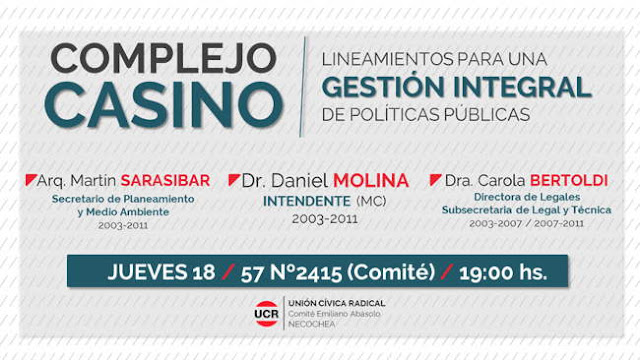 Con un panel integrado por el Intendente Daniel Molina (2003-2011) junto al Arq. Martín Sarasibar y la Dra. Carola Bertoldi, la Unión Cívica Radical necochense invita a toda la comunidad a un espacio de debate acerca de lo actuado desde la Municipalidad con respecto al Complejo Casino, y los desafíos de cara a la decadencia manifiesta que exhibe lo que fuera una de las postales características y distintivas de la ciudad balnearia.