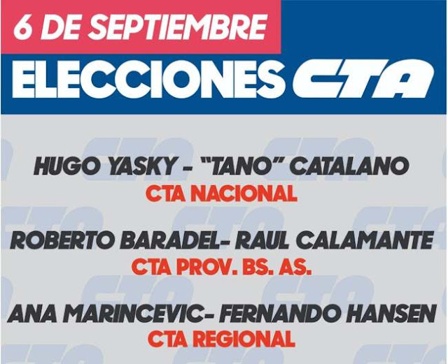 EL jueves 6 de septiembre del 2018 La CTA de los Trabajadores, encabezada por Hugo Yasky, lleva adelante en todo el territorio nacional elecciones de autoridades para renovar todas sus categorías .