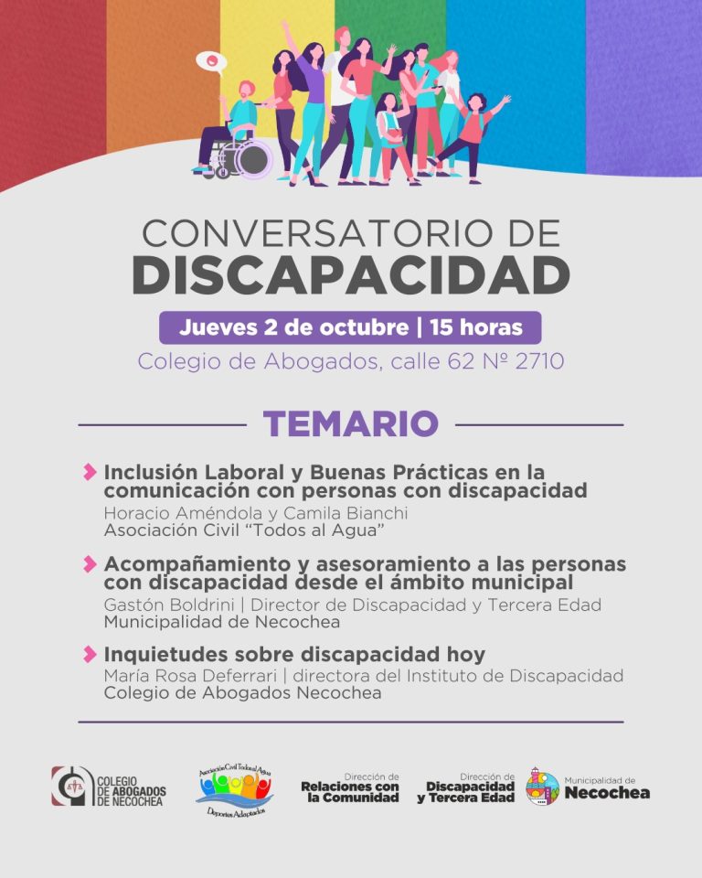 Con la organización conjunta de múltiples instituciones, entre ellas la Municipalidad, este jueves 2 de octubre a las 15 horas, el Colegio de Abogados de Necochea será sede de un Conversatorio sobre Discapacidad, un espacio de diálogo y reflexión destinado a promover la inclusión, compartir experiencias y acercar información sobre derechos y prácticas en torno a la temática.