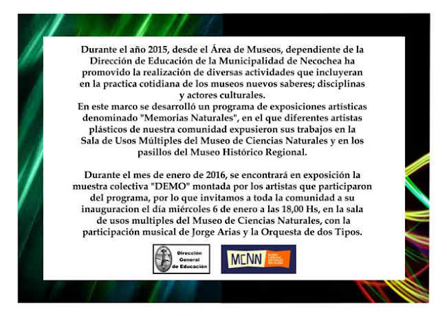 Durante el mes de enero de 2016, se encontrará en exposición la muestra colectiva «DEMO» montada por los artistas que participaron del programa, por lo que invitamos a toda la comunidad a su inauguración el día miércoles 6 de enero a las 18 Hs, en la sala de usos múltiples del Museo de Ciencias Naturales, con la participación musical de Jorge Arias y la Orquesta de dos Tipos.