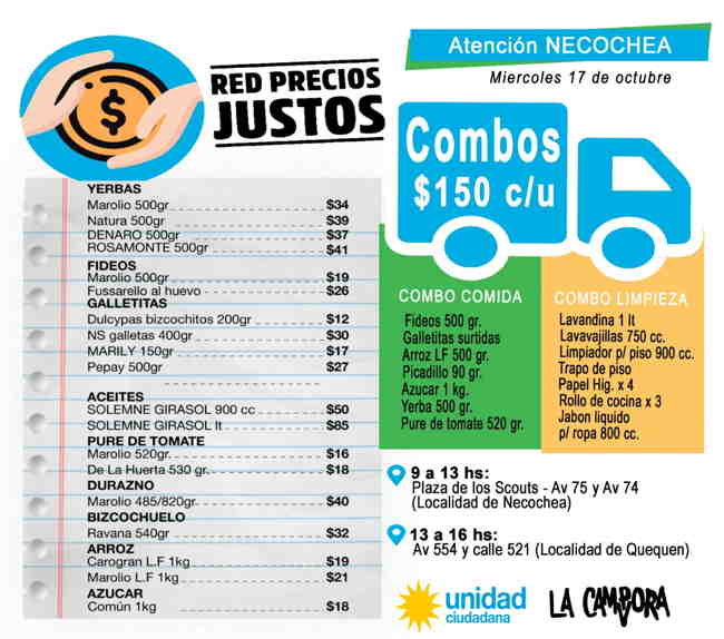 Este miércoles, en un operativo organizado por Unidad Ciudadana de Necochea y la Red de Precios Justos, se expenderá alimentos secos y artículos de limpieza a bajo costo en plazas de Necochea y Quequén.