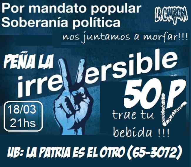 Este sábado 18 de Marzo a partir de las 21 hs tendrá lugar la peña «La Irreversible», organizada por la agrupación La Cámpora de Necochea y Quequén.