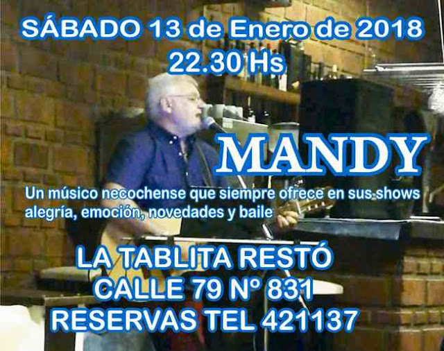 Este Sábado 13 de Enero de 2018 a las 22.30Hs, nuevo show de Mandy presentando nuevas canciones, algunas propias, siempre ofreciendo alegría, emoción, reflexión, diversión y en el final un bailable como para bajar todo lo comido y bebido.