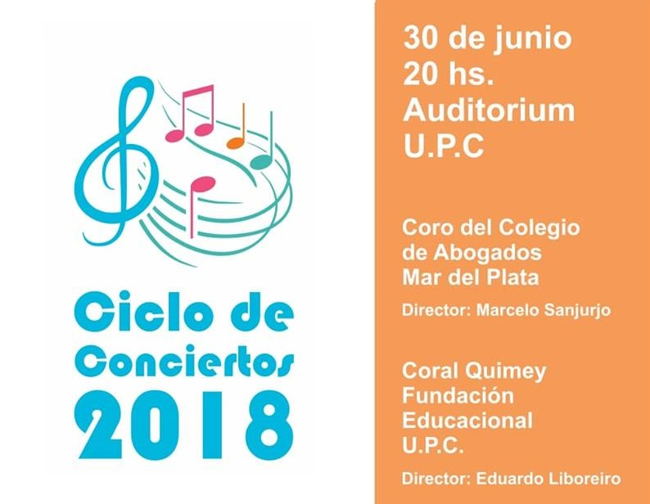La Fundación Educacional de la U.P.C. invita al publico en general en el marco del «Ciclo de Conciertos 2018» al encuentro Coral que se realizara en nuestra ciudad, con la participación del Coro del Colegio de Abogados de Mar del Plata y el Coro Coral Quimey de la Fundación Educacional de la U.P.C.