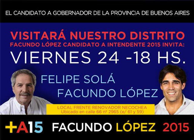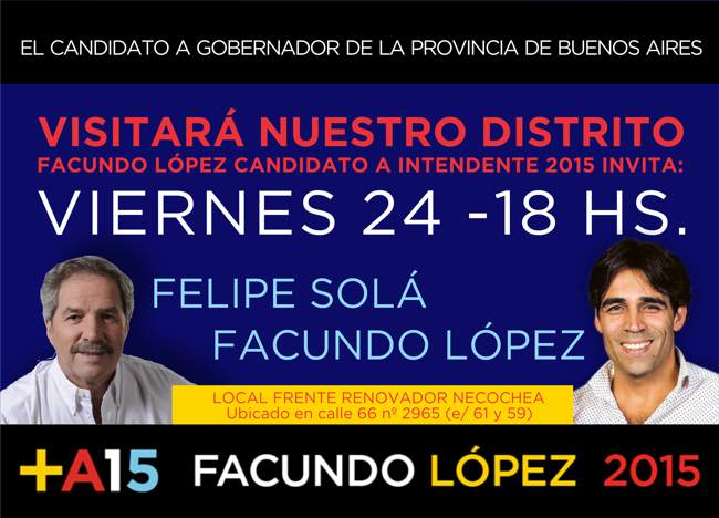 El Dr. Facundo López, candidato a Intendente por el Frente Renovador en Necochea, recibirá mañana viernes 24 de julio a las 18hs en el local partidario ubicado en Calle 66, N° 2965, a Felipe Solá, candidato a Gobernador por la Provincia de Buenos Aires.