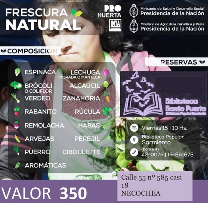 Con un valor de 350 pesos por bolsón, este viernes 15 a partir de las 10 hs. se comercializará Frescura Natural con 15 productos cosechados en el núcleo urbano local. La institución sin fines de lucro que abrirá sus puertas para la venta es la Biblioteca Popular Sarmiento de Barrio Puerto, en calle 55 nº 585, casi 18.