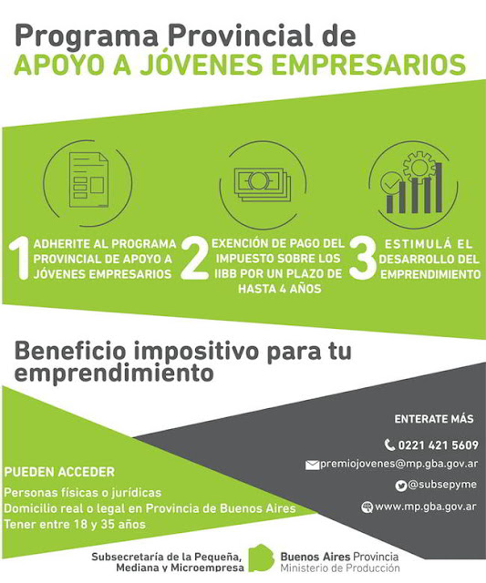 La Subsecretaría de Producción de la Municipalidad de Necochea, a través de la Subsecretaria de la Pequeña, Mediana y Microempresa del Ministerio de Producción bonaerense, informa a los propietarios de Pymes menores de 35 años que ahora también pueden acceder a la exención del pago del Impuesto sobre los Ingresos Brutos, siendo este uno de los beneficios que otorga la adhesión al Programa Provincial de Apoyo a Jóvenes Empresarios.