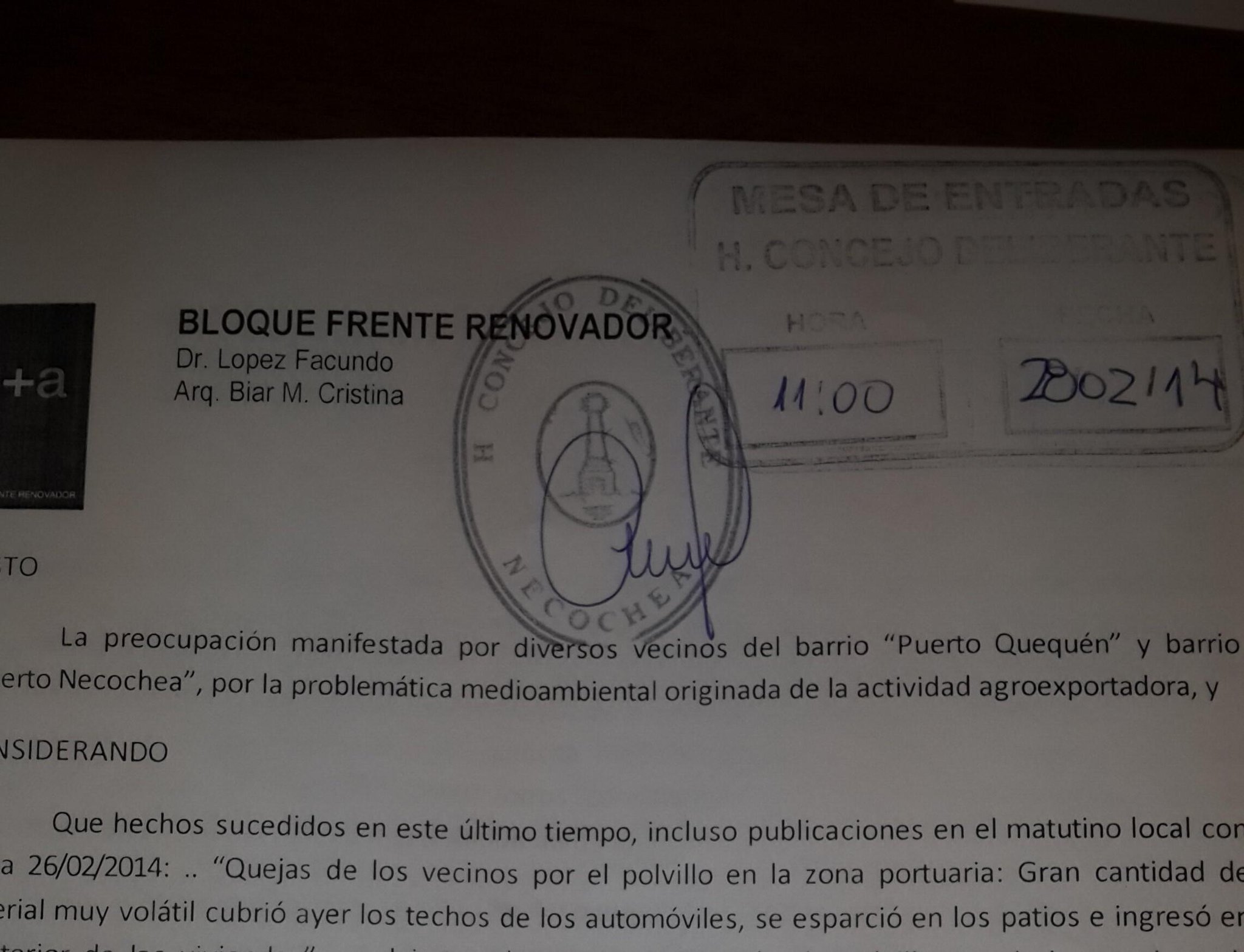 La preocupación manifestada por diversos vecinos del barrio “Puerto Quequén” y barrio “Puerto Necochea”, por la problemática medioambiental originada de la actividad agroexportadora, y