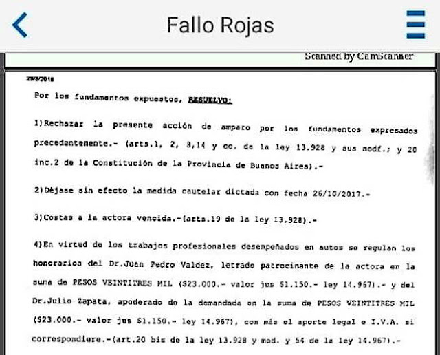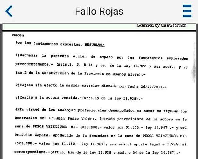 El Juez Herrera consideró que el recurso presentado por Rojas no justificaba «la vía excepcional y habiendo un proceso anterior con el mismo objeto» (lo iniciado por Tesón) «…corresponde desestimar la vía del amparo por inadmisible».
