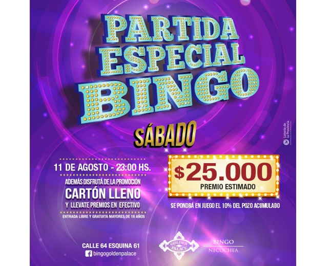 El sábado a las 23hs se llevará a cabo una nueva Partida Especial, en la que se pondrá en juego el 10% del pozo acumulado a la fecha más lo recaudado a premio bingo, donde podrás ganar un premio estimado de $25.000. La sala abre sus puertas 20hs con sorteos de importantes premios en efectivo.