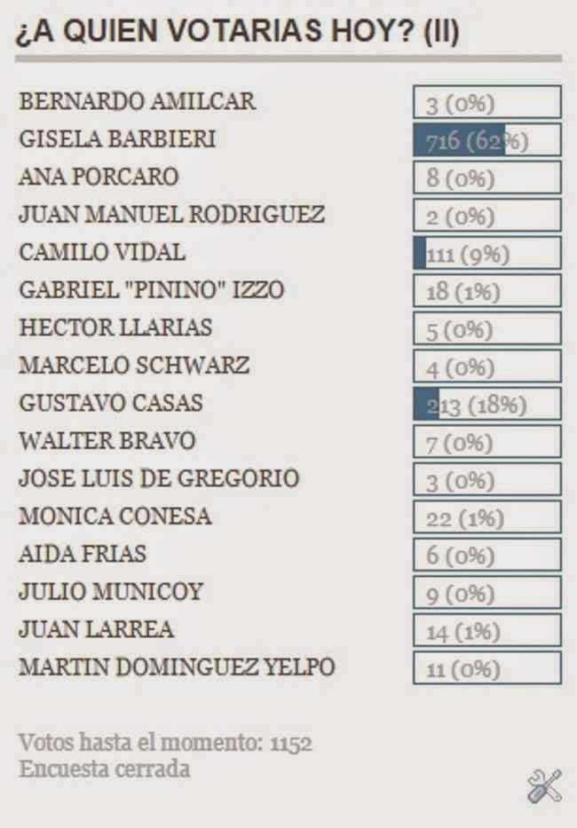 De manera similar a lo sucedido en la encuesta anterior difundida por LANUEVACOMUNA.COM, los candidatos con mayor cantidad de votos encontraron, de manera llamativa, una gran diferencia con el resto de las opciones, que, por diversas razones, no alcanzó niveles especiales de participación. Tal fue el caso de Bernardo Amilcar, Ana Porcaro, Juan Manuel Rodríguez, Gabriel «Pinnino» Izzo, Héctor Llarías, Marcelo Schwarz, Walter Bravo, Jose Luis de Gregorio, Mónica Conesa, Aida Frías, Julio Municoy, Juan Larrea y Martín Domínguez Yelpo.