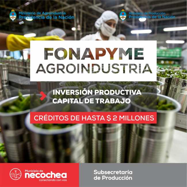 La Subsecretaría de Producción e Innovación Tecnológica informa a las empresas agroalimentarias y agroindustriales del Distrito de Necochea que, a través de un trabajo interministerial, las carteras nacionales de Agroindustria y Producción abrieron la primera convocatoria para la presentación de proyectos al Fondo Nacional de Desarrollo para la Micro, Pequeña y Mediana Empresa (FONAPyME), persiguiendo la finalidad de aumentar el agregado de valor en la región de origen.