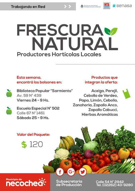 Sobre el final de la semana en curso, la saludable y económica oferta de «Frescura Natural» se volverá a conseguir en dos bocas de expendio apostadas en instituciones sin fines de lucro de los barrios Puerto y Obrero. Así, desde las 9 de este viernes 24 se realizará la primera comercialización en la Biblioteca Popular «Sarmiento», ubicada en Avenida 59 Nº 439; mientras que, en la mañana del sábado 25, y con el proceso de logística y distribución a cargo de la Asociación Julieta Pagano, los bolsones podrán conseguirse en la Escuela Especial N° 502, sita en la calle 67 al 1461.