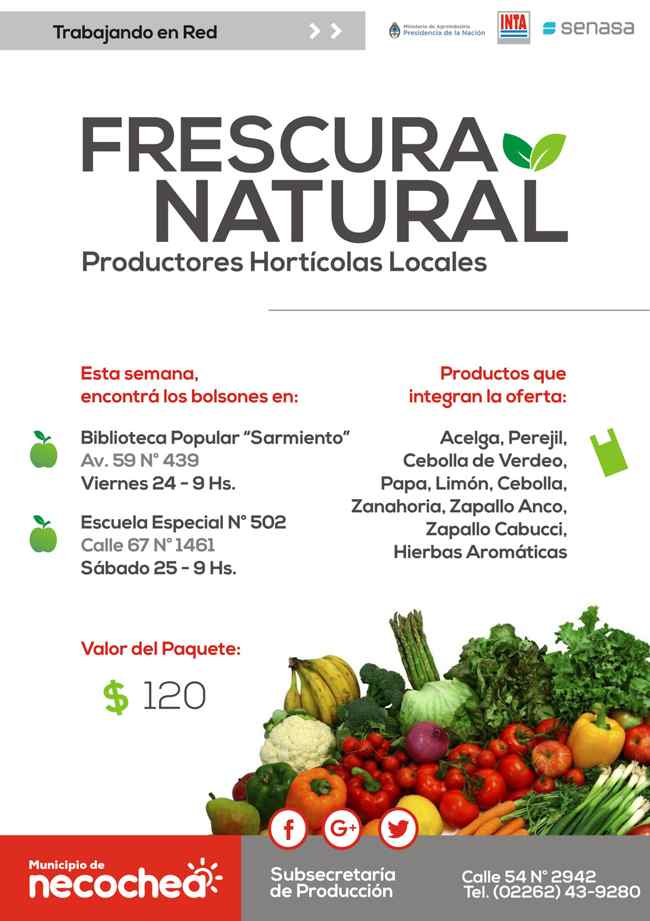 Sobre el final de la semana en curso, la saludable y económica oferta de «Frescura Natural» se volverá a conseguir en dos bocas de expendio apostadas en instituciones sin fines de lucro de los barrios Puerto y Obrero. Así, desde las 9 de este viernes 24 se realizará la primera comercialización en la Biblioteca Popular «Sarmiento», ubicada en Avenida 59 Nº 439; mientras que, en la mañana del sábado 25, y con el proceso de logística y distribución a cargo de la Asociación Julieta Pagano, los bolsones podrán conseguirse en la Escuela Especial N° 502, sita en la calle 67 al 1461.