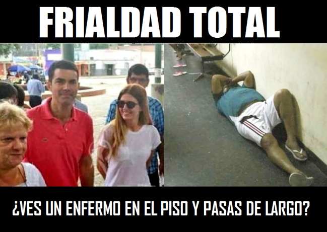En el punto 2:37 se ve al hombre tirado en el suelo, a la derecha de la imagen. Viste ropa deportiva de color claro y la cámara lo enfoca. Inmediatamente se ve la inconfundible figura de Isabel Macedo pasar junto al enfermo, a pocos centímetros. No se detiene, no pide la presencia de un médico, no grita, no se indigna ni ordena que se traiga una camilla para el enfermo, a pesar de la evidencia de que se trata de un caso flagrante de atentado contra la dignidad humana. La maniobra del saludo le permite pasar a un metro de él. Urtubey y Macedo siguen su photo call por el pasillo.