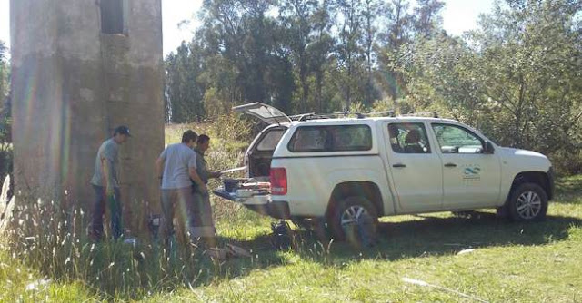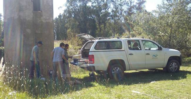 Pablo Heiland y Eugenio Cardenau, de la Subsecretaría de Desarrollo Agroindustrial, estuvieron en el paraje Las Cascadas interiorizándose sobre estas tareas que viene desarrollando en el distrito el grupo de Hidrogeología de la Universidad de Mar del Plata desde hace 10 años.