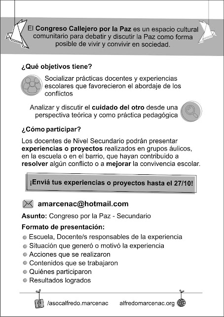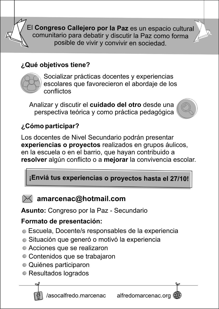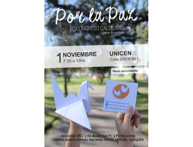 El miércoles 1 de noviembre se realizará un nuevo Congreso por la Paz para docentes organizado por la Asociación Civil Alfredo Marcenac. El mismo es un espacio cultural comunitario para debatir y discutir la Paz como forma posible de vivir y convivir en sociedad.