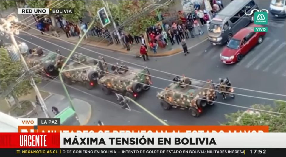 Según el corresponsal de teleSUR, Freddy Morales, es elevada la cantidad de militares que se encuentran en Plaza Murillo. Cerraron los ingresos a esta área e impiden el trabajo de los periodistas. Muchos de los militares están encapuchados.
