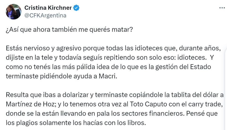 “¿Así que ahora también me querés matar?”, se preguntó la dos veces mandataria a través de su cuenta de X, y continuó: “Estás nervioso y agresivo porque todas las idioteces que, durante años, dijiste en la tele y todavía seguís repitiendo son solo eso: idioteces”.
