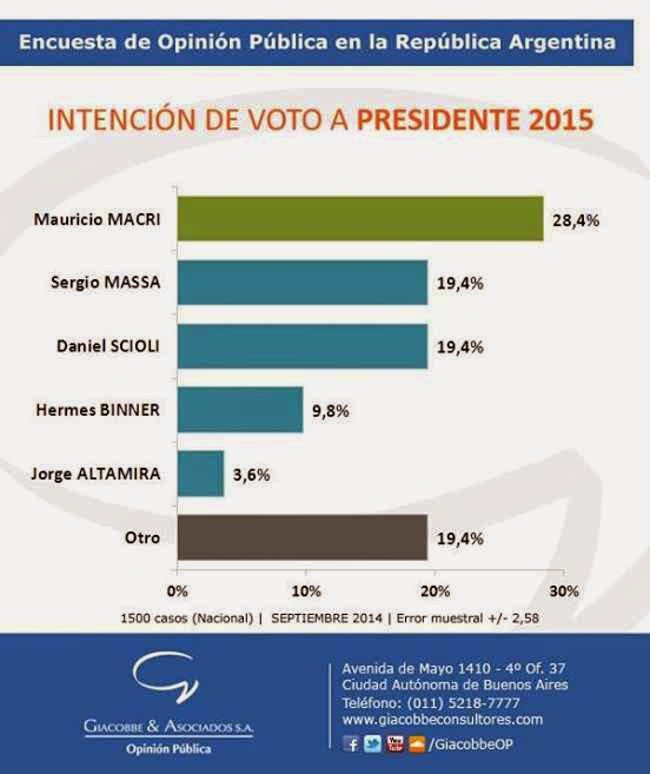 Sobre un total de 1500 casos a nivel nacional y un margen de error de menos del 3%, el actual Jefe de Gobierno de la Ciudad Autónoma de Buenos Aires y candidato del PRO, Mauricio Macri, lidera ampliamente los resultados de la encuesta con un 28, 4%.